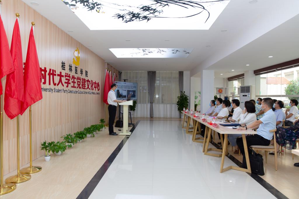 黄照权代表学校对调研组的到来表示热烈欢迎。黄照权向调研组简要介绍了学校办学历史、教学科研、附属医疗单位、防疫抗疫、学生返校复学、更大建博等情况,并就党建工作和思想政治工作的主要做法和工作亮点进行汇报。他指出桂林医学院始终高度重视党建工作,重视加强政治引领、加强制度建设和压实主体责任,近年工作重点强调抓基层党支部建设,学校现有15个二级党组织,179个党支部,针对学生党支部、教师党支部分别设置支部建设标准,搭建党建管理平台加强管理,现在各级党组织的组织力得到提升,意识形态引领力不断提高,从严治党责任感明显增强,基层党组织建设工作取得良好成效。学校思想政治工作围绕立德树人根本任务,多措并举加大激励与投入,将思政课作为重点课程、马克思主义理论学科作为重点学科、马克思主义学院作为重点学院建设,配齐思政专任教师和教学活动经费、设置思政教师和辅导员专项绩效、设立校内多项思政专项研究课题并划拨经费等、开展师德师风建设年活动等工作,学生获各类奖项增多,学校德育成效显著。