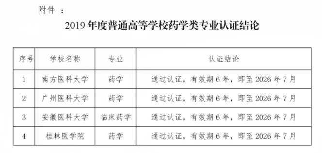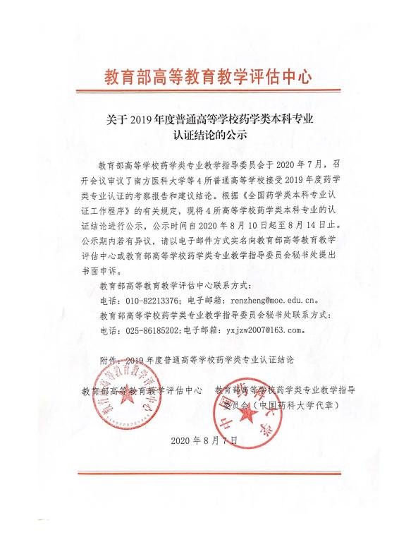 根据教育部高等教育教学评估中心文件,我校药学本科专业通过了2019年度普通高等学校药学类本科专业认证。认证有效期从2020年8月-2026年7月。