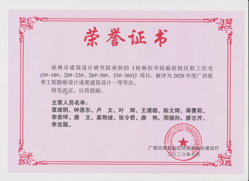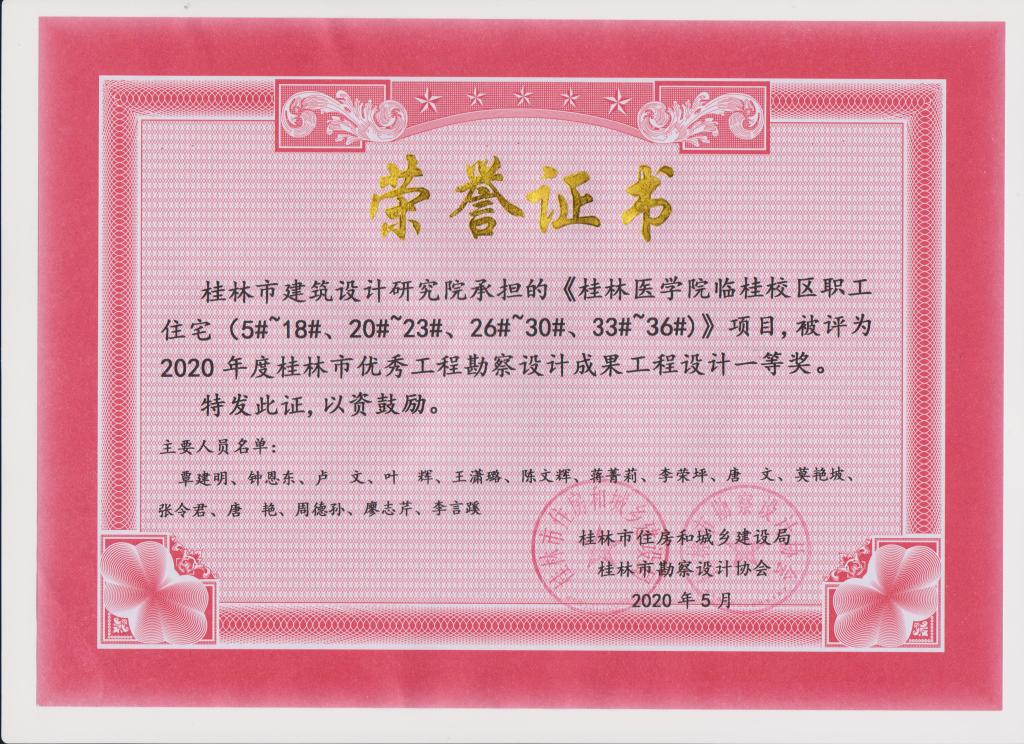 近日,我校临桂职工住宅区项目传来喜讯,由桂林市建筑设计研究院承担的我校临桂校区职工住宅区(5#-18#、20#-23#、26#-30#、33#-36#)项目,被评为2020年度桂林市优秀工程勘察设计成果工程设计一等奖及2020年度广西优秀工程勘察设计成果建筑设计一等奖。由广西建工建团第五建筑工程有限责任公司、第三建筑工程有限责任公司、联合建设有限公司及广西兴华建工集团股份有限公司承建的9#、10#、18#、19#、20#、21#、22#、23#、25#、26#、27#、28#、29#、30#、32#、33#、35#、36#工程荣获2020年广西建设工程“真武阁杯”奖(最高质量奖)。