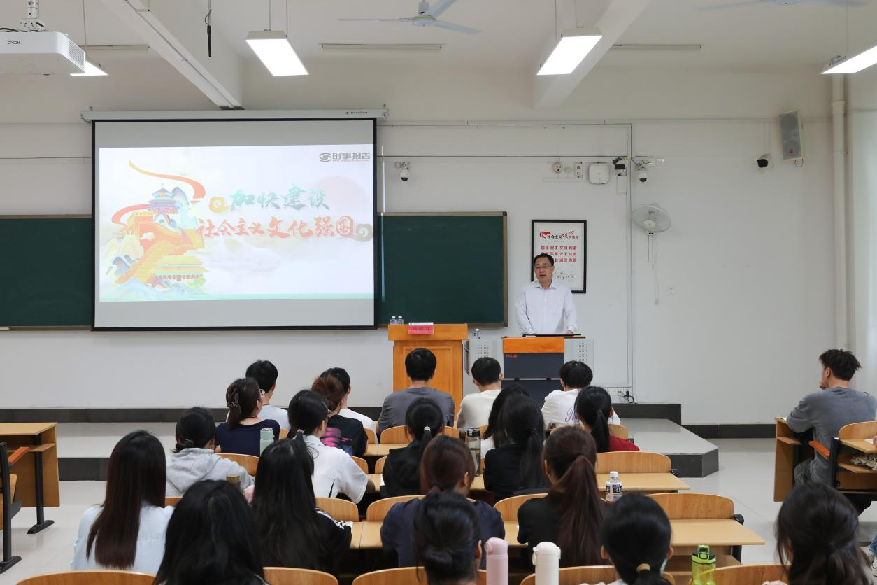 课堂上,马献力通过梳理近期我国在文化领域出现的热点现象,将“哪吒登顶”彰显文化自信、“北京中轴线——中国理想都城秩序的杰作”列入《世界遗产名录》等热点事件作为案例,深入浅出地向同学们讲述了建设社会主义文化强国的重要意义。
