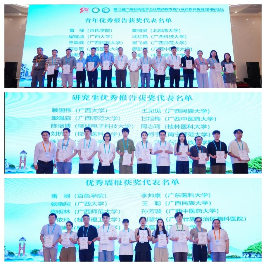 为推动多维度学术碰撞,论坛设置“1个主会场+6个分会场”的多层次交流架构,包含了12场大会报告、39场邀请报告、61场青年学者报告及66场研究生快闪报告,并同步展示了75份高质量学术墙报,内容涵盖有机化学、药物化学、化学生物学、分子靶标与药理学、精准诊疗、蛋白降解与修饰等前沿领域,从技术创新、学科融合、人才培育等维度展开深度研讨,全面呈现最新研究成果与发展趋势。论坛还评选并颁发了优秀青年报告奖、优秀快闪报告奖和优秀墙报奖。随后,下一届承办方广西大学进行了第四届广西有机化学论坛宣讲,论坛在组委会张业教授的回顾总结下闭幕。