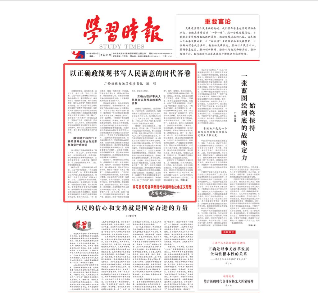 正确的政绩观,是为政之德、从政之道、施政之要。党的十八大以来,习近平总书记围绕树立和践行正确政绩观作出一系列重要论述,深刻阐明了“政绩为谁而树、树什么样的政绩、靠什么树政绩”等重大理论和实践问题,为广大党员干部在正确轨道上履职干事提供了根本遵循。我们深入学习贯彻习近平总书记的重要论述,把树立和践行正确政绩观的重要要求体现到坚定拥护“两个确立”、坚决做到“两个维护”的实际行动上,坚持实干为要、创新为魂,用业绩说话、让人民评价,在推动边疆民族地区高质量发展和现代化建设的生动实践中,努力交出人民满意的时代答卷,奋力谱写中国式现代化广西篇章。