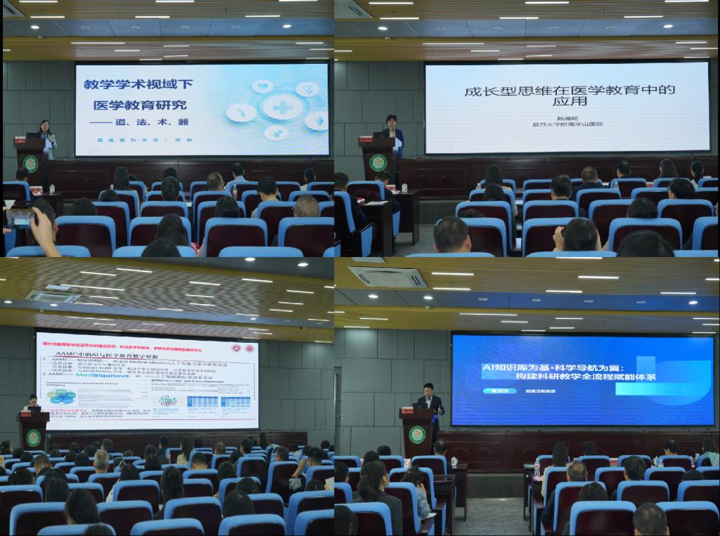 在特邀报告环节,西南医科大学陈勤教授从“道、法、术、器”层面阐释医学教育研究路径;复旦大学赖雁妮教授探讨“成长型思维”在教学中的应用;北京大学于晨教授介绍了AI赋能医学教育的北大实践;超星泛雅集团秦波涛总经理分享了基于AI知识库的科研教学全流程赋能体系。