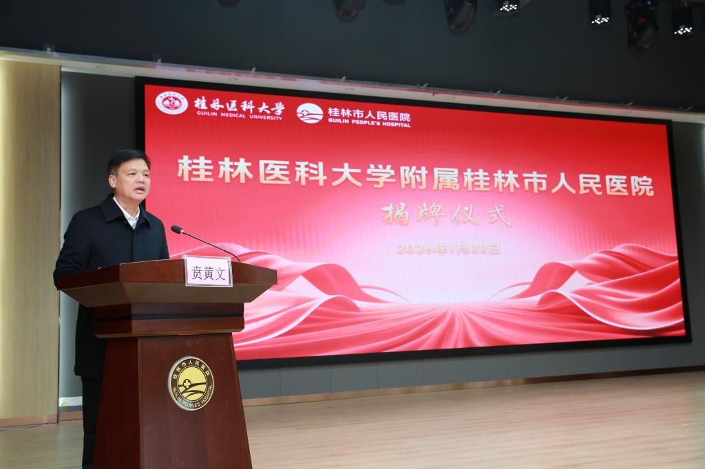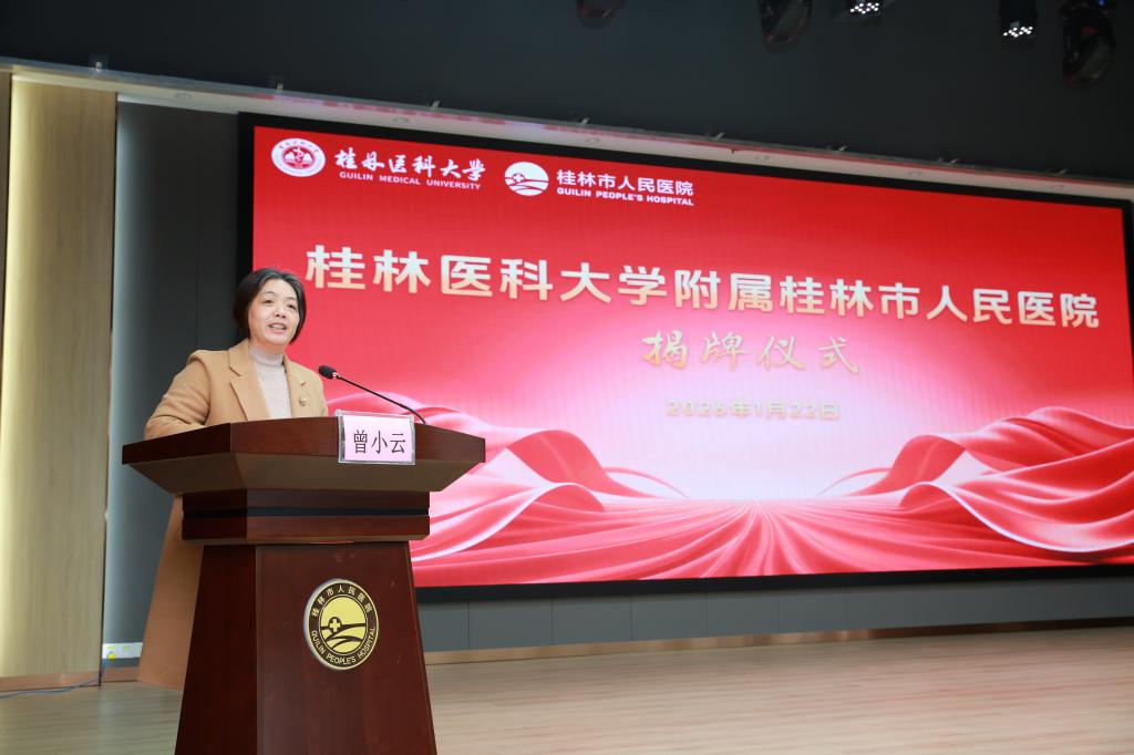 曾小云在致辞中指出,高水平的附属医院是医学人才培养的主阵地、科技创新的策源地、社会服务的先锋队,校院深度融合是时代所需,更是使命所系。将桂林市人民医院纳入学校附属医院体系,是学校拓展临床教学资源、优化医学人才培养布局的关键一步。她充分肯定了桂林市人民医院在区域医疗中心建设、临床医疗服务等方面的扎实基础和显著成效,并表示学校将在人才培养、学科建设、科研平台共享、师资队伍建设等方面加大支持力度。同时,她对医院未来发展提出三点殷切希望:一是坚持医教研并重,筑牢高质量发展根基。以揭牌为契机强化学科内涵,将22个广西临床重点专科优势转化为教学与科研优势,持续优化“青苗、后备、高层次”人才培养体系;二是勇担育人主责,打造同质化教学标杆。促进优质医疗资源高效转化为优质教学资源,完善教学管理,确保临床教学质量与学校直属附属医院同质化;三是深化联动融合,争做校院协同排头兵。主动融入大学发展全局,在发展规划、资源统筹及文化建设上与学校同频共振,真正实现从“合作”走向“融合”、从“并列”迈向“一体”的跨越。