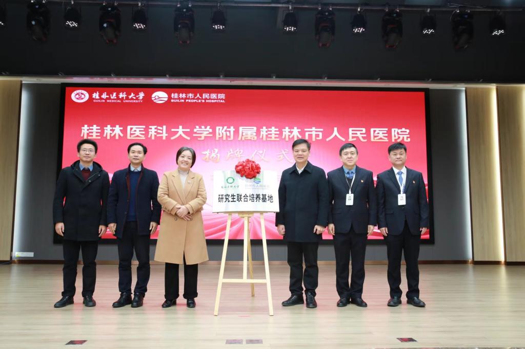 随后,在与会领导嘉宾的共同见证下,李清华与附属桂林市人民医院负责人共同签署《桂林医科大学非直属附属医院合作协议》。双方领导共同为“桂林医科大学附属桂林市人民医院”、“桂林医科大学研究生联合培养基地”揭牌。