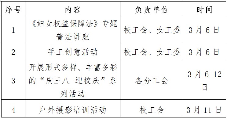 为庆祝第113个“三八”国际劳动妇女节及建校88周年,团结引领广大教职工凝心聚力,为学校的改革建设和发展做贡献,营造浓厚校庆氛围,经研究决定开展“庆三八 迎校庆”系列活动,具体活动安排如下: