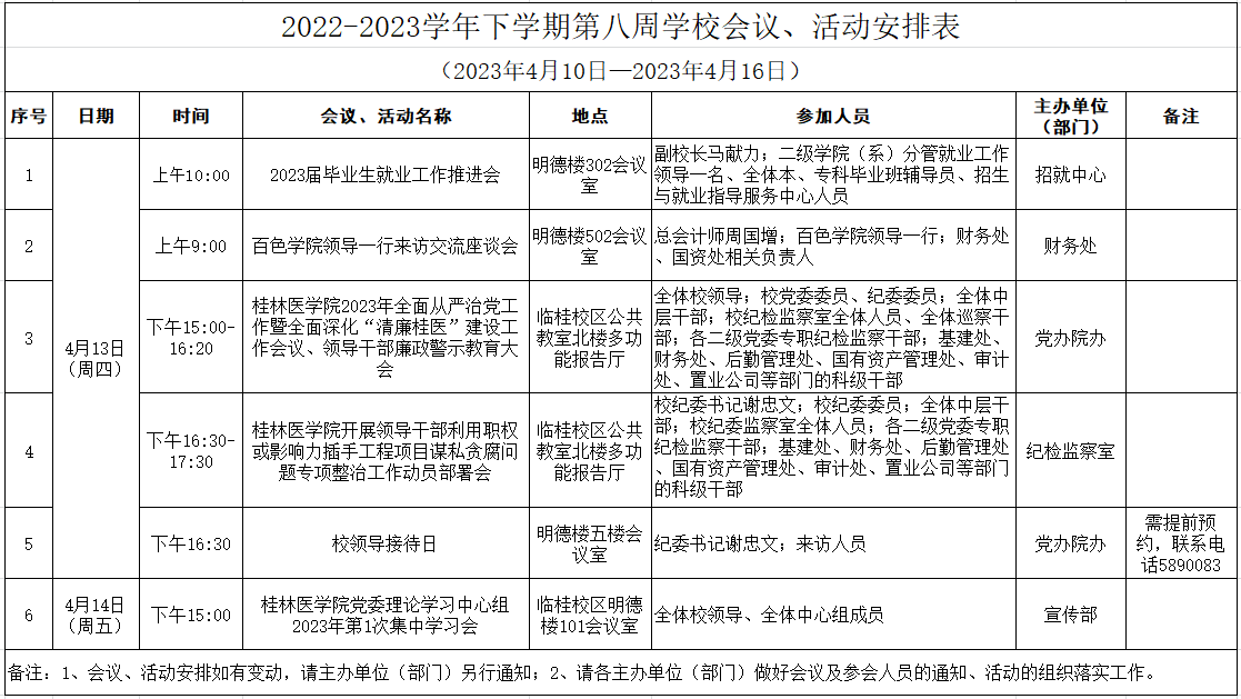 2022-2023学年下学期第八周学校会议、活动安排表(2023年4月10日—2023年4月16日)