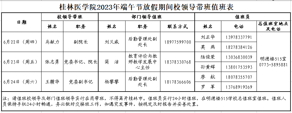 附件:桂林医学院2023年端午节放假期间校领导带班值班表