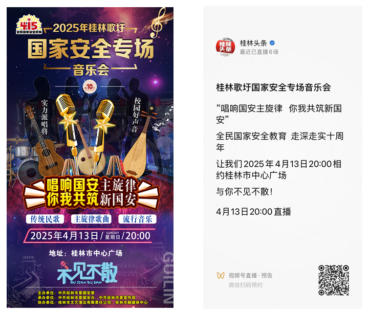 2025年是国家安全法颁布施行十周年,4月15日是第十个全民国家安全教育日。根据《中共桂林市委员会国家安全委员会办公室关于收看2025年桂林歌圩国家安全专场音乐会的通知》要求,请各单位、各部门组织师生线上线下收看2025年4月13日(周日)20:00在桂林市中心广场举办的桂林歌圩国家安全专场音乐会,并积极发表正向评论。