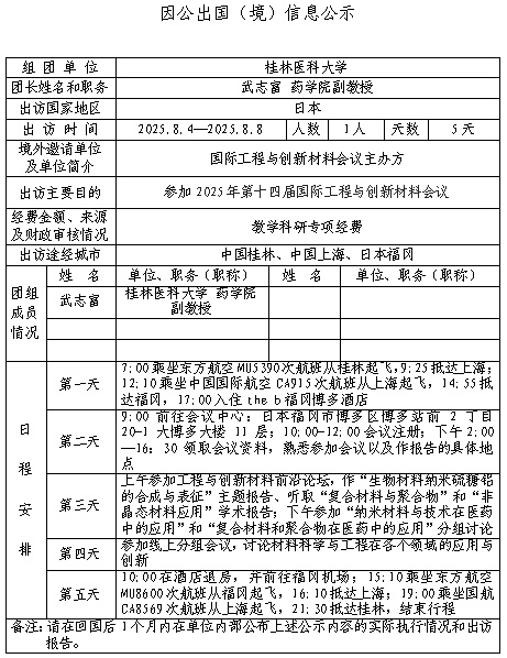 根据中央因公临时出国(境)的有关文件规定和自治区因公临时出国(境)管理工作的要求,现将出访人员身份信息、公务安排、经费预算和来源、行程安排、境外邀请单位等信息在https://www.glmc.edu.cn/进行公示,公示期从2025年6月23日至2025年6月27日止,共5个工作日。如对公示内容有异议,可以电话或书面形式进行反馈。