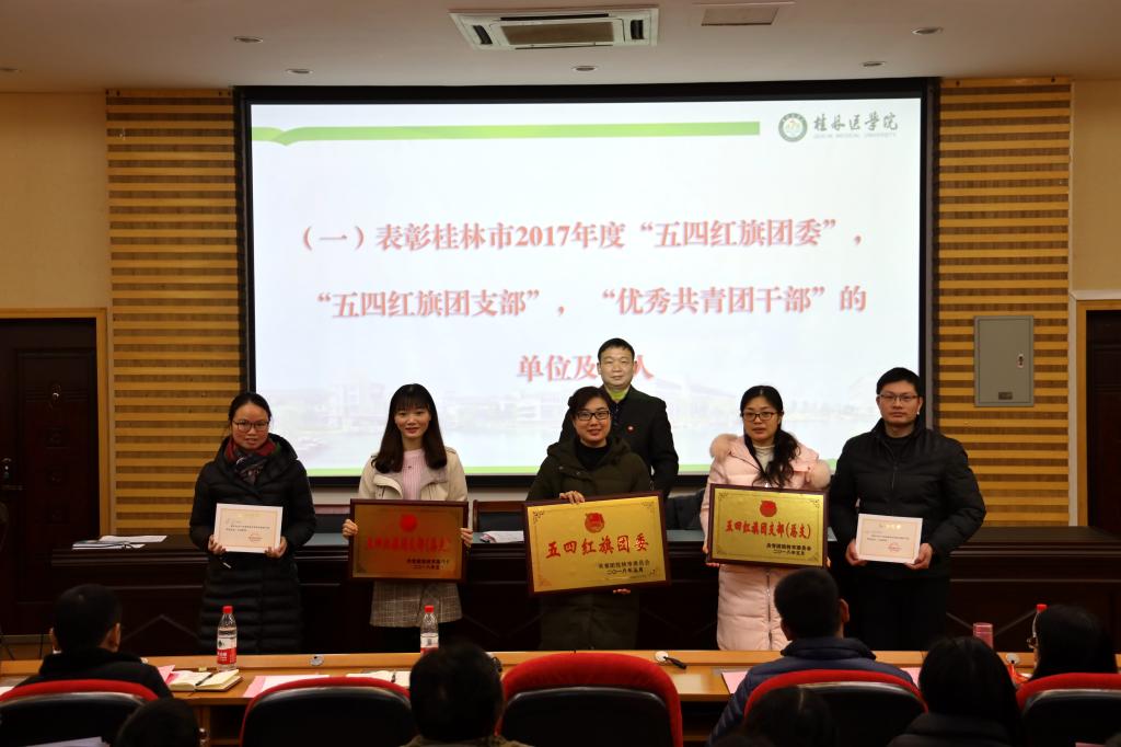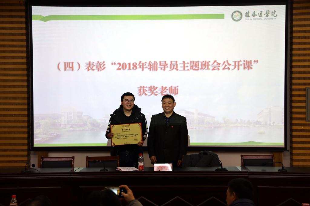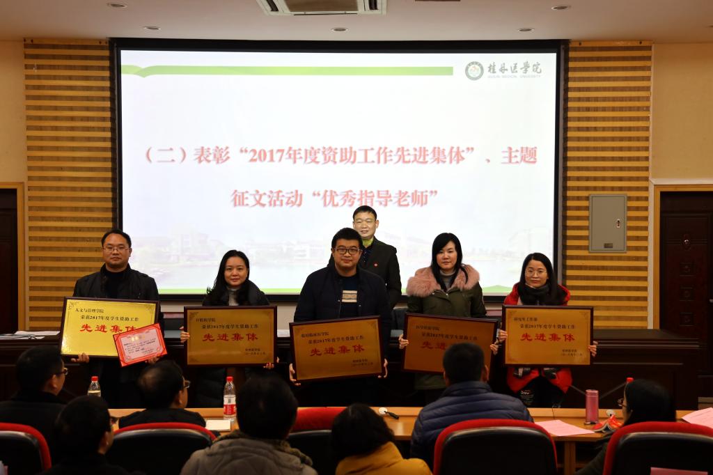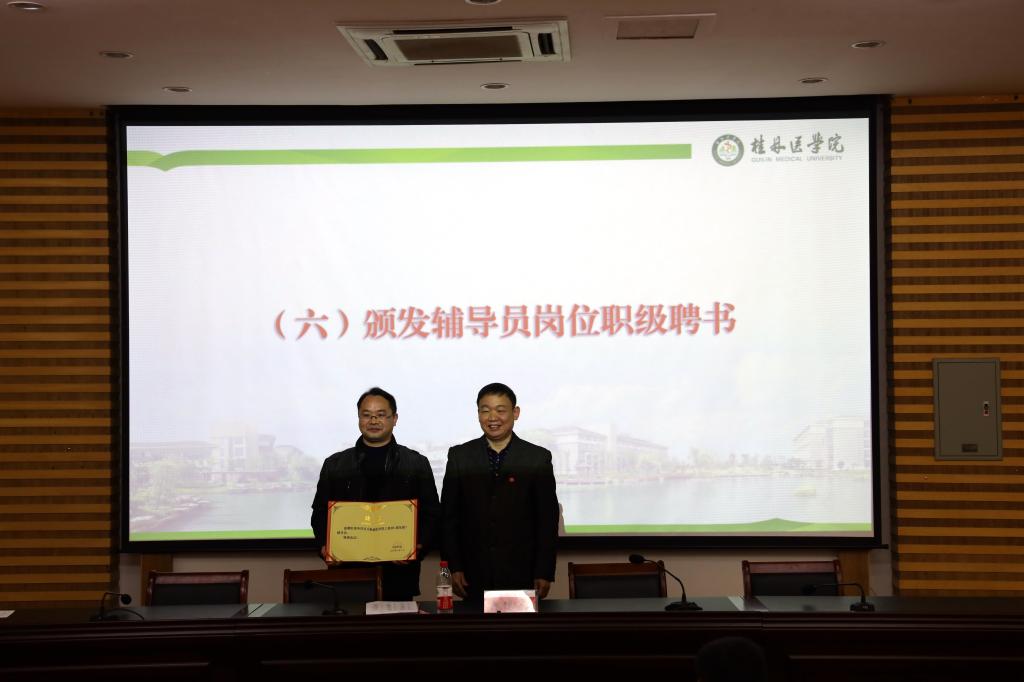 学生工作部(处)、校团委、武装保卫处负责人分别对本部门本学期的工作情况进行总结,并就寒假及下学期相关工作进行部署。4名辅导员分享了外出学习经验及心得体会。会议还对对桂林市2017年度“五四红旗团委”、“五四红旗团支部”、“优秀共青团干部”、“2017年度资助工作先进集体”、主题征文活动“优秀指导老师”、“2018年全区高校大学生5·25心理健康教育活动月”获奖老师、“2018年辅导员主题班会公开课”获奖老师、“2018年辅导员职业能力大赛”获奖老师进行表彰和颁发辅导员岗位职级聘书。