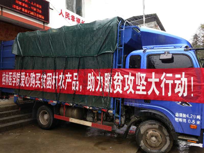 1月11日,桂林医学院附属医院的工作群热闹非凡,全院职工纷纷下单认购来自龙胜贫困村的“土货”,短短一天内就卖了装满三大卡车的“土货”2万多斤。原来,这是桂林医学院附属医院开展的购买贫困户农产品爱心大行动,当天为贫困户共募集近 10 万元。有效地化解了贫困山区“土货”销售难问题,帮助贫困户增加了收入,解决了实际困难。