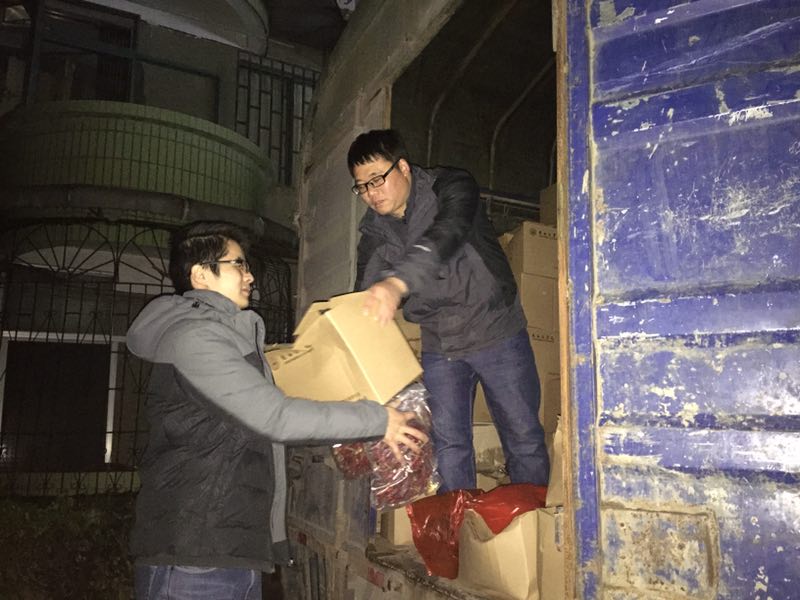 由于当天拉来的货物非常多,眼看天黑了,还有一货车的很多东西还没来得及卸货,天又下着雨,许多物资不能被淋湿,时间紧迫,保守估计,要将1500箱货物卸完并转移到室内少也要花5个小时。那么,物资又搬放哪里合适呢?这成了一个难题。后来在离退办的紧急协助下,志愿者把离退休活动中心腾空出来,更多的志愿者和职工也迅速赶来了。