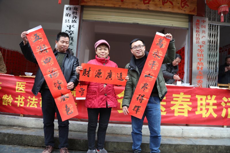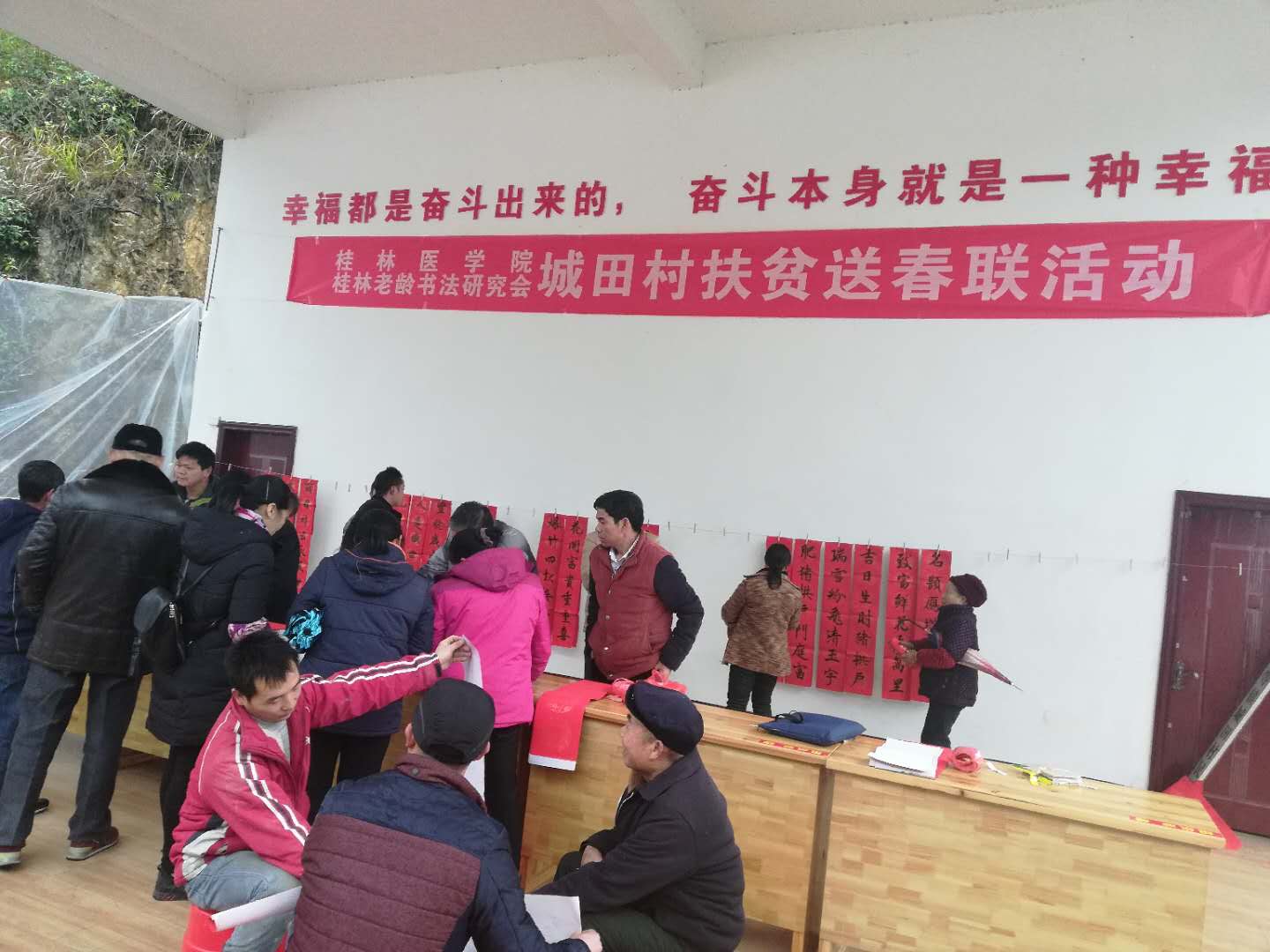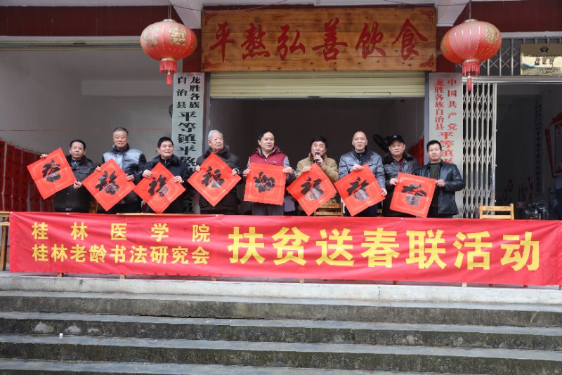 为了扎实推进脱贫攻坚工程,营造吉祥如意的春节氛围,弘扬向上向善的文明风尚,把幸福和谐送到贫困群众;元月16日分别在龙胜县平等镇平熬村和城田村,我校与桂林市老龄书法研究会联合开展文化扶贫送春联活动。