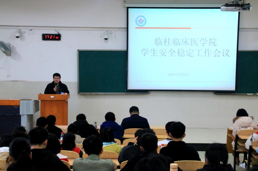 为加强学校安全稳定工作,树立学生的安全防范意识,2019年3月6日下午,临桂临床医学院在临桂校区南楼S103教室召开学生安全稳定工作会议,会议由桂林医学院第二附属医院(临桂临床医学院)党委副书记刘梦青主持,学院辅导员及学生干部、宿舍长共200余人参加了会议。