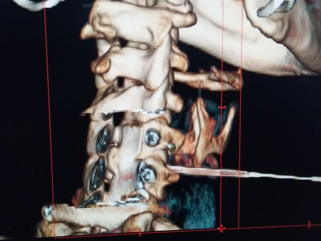 为保证治疗效果,桂林医学院第二附属医院疼痛团队在公主任带领下制定了详细的治疗方案,决定采用颈椎低温等离子椎间盘髓核消融术进行治疗,同时多管齐下:一方面完善影像学、实验室等检查进一步明确诊断;一方面准备手术同时对小李进行脱水、营养神经等,暂时延缓病情进一步发展,并予颈椎旁神经阻滞治疗,改善神经根周围组织循环,减轻水肿。在手术中,公主任团队利用CT测量软件计算出穿刺点和穿刺角度,用B超引导慢慢地将直径为0.5毫米的穿刺针送到突出物内,CT扫描确认针尖位置准确。置入等离子刀头(刀头不过一根针粗细),调整刀头方向,再次确认位置后开始消融手术。整个手术过程约1小时,术后,小李的肩膀和手不那么疼,特别是手指又能拿筷子了。一个月后,小李恢复得很好,肩膀和手不麻也不痛,手也有了力气。