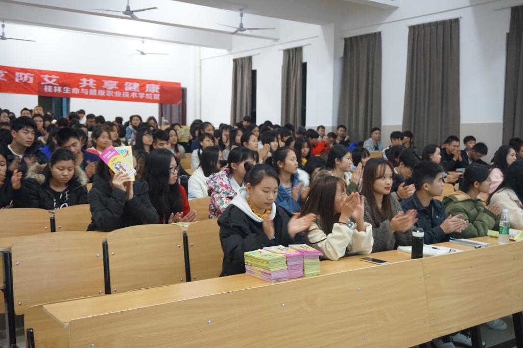 讲座除介绍艾滋病的基本知识、艾滋病的危害、艾滋病的传播途径、艾滋病的发展趋势以及安全套的正确使用方法外,还介绍国家“四免一关怀”相关政策。在艾滋病防治知识宣传上,重点介绍“为什么要有‘艾滋病自主检测’的意识”“艾滋病自主检测的渠道”“广西区高校艾滋病检测包售卖机”“便携式艾滋病自主检测试剂盒的使用”等相关知识。