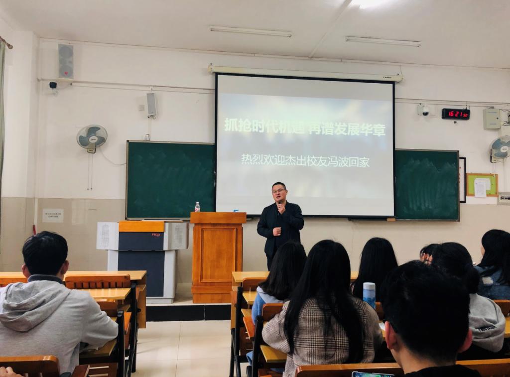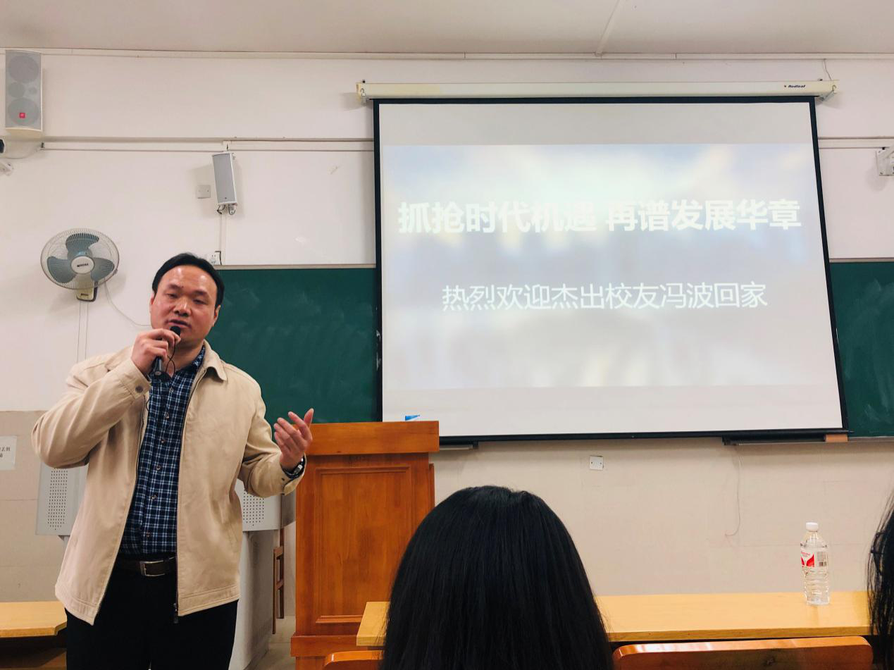 伴随着同学们热烈的掌声,冯波根据亲身经历从各个方面向同学们做了详细的经验分享。首先,他指出在大学初期做好大学生职业规划的重要性,明确自己的目标,做好定位并在学习生活中付诸实际努力。同时,鼓励同学们在校期间要多读书,提升自己的文学素养,适当进行社会实践,拓宽眼界、积累实践经验、锻炼语言表达能力,从而提高自身综合素质。最后,胡友根对此次交流会进行了总结发言,肯定了此次交流会的重大意义,并强调学生应向冯波学长学习,充分利用大学时光,完善自我,调节好学习与工作的关系。
