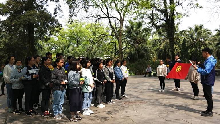 在祭扫仪式上,主持人怀着崇敬之情介绍陈光烈士的生平事迹。陈光作为一名共产党员兢兢业业为人民服务,虽因叛徒出卖被捕,但在狱中遭遇酷刑而坚贞不屈,英勇就义。他的躯体虽已归尘,但爱国精神将永世长存。参与祭扫的同学们依次有序地环绕陵墓一圈,敬献手中鲜花,为先烈默哀三分钟并庄重地鞠躬,以此表达对先烈的深切哀悼与敬仰之情。在陈光烈士墓前,全体同学庄严宣誓“我们将用一生的坚定、坚守与坚持,做一名合格的共产主义事业接班人”,表达青年团员不忘先烈,继承和发扬他们不屈不挠的爱国精神,为民族、为祖国的繁荣富强奋斗的强烈愿望。
