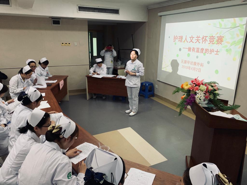 为积极响应护理部今年的人文关怀主题,4月2日,附属医院乳腺甲状腺外科举办“护理人文关怀竞赛---做一个有温度的护士” 护理服务规范技术练兵活动。该科室护理人员共20余人参加比赛,护士长徐红英、副护士长黄方艳及科室资历最高的王满娣老师担任裁判。