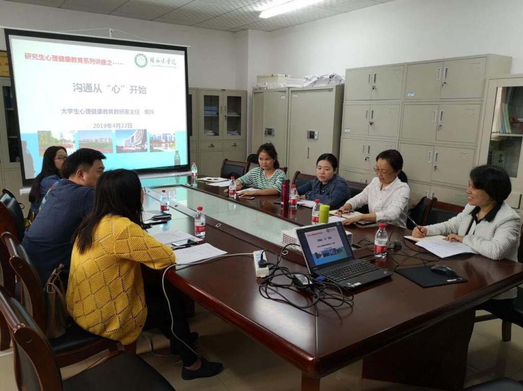 为提高师生沟通技巧,促进研究生心理健康教育工作水平,4月22日下午,研工部在弘德楼307室开展研究生辅导员心理专题培训,特邀校大学生心理健康教育教研室主任戴玲做题为“沟通从心开始”的专题培训,研究生工作部领导、老师,全体研究生辅导员参加了会议。