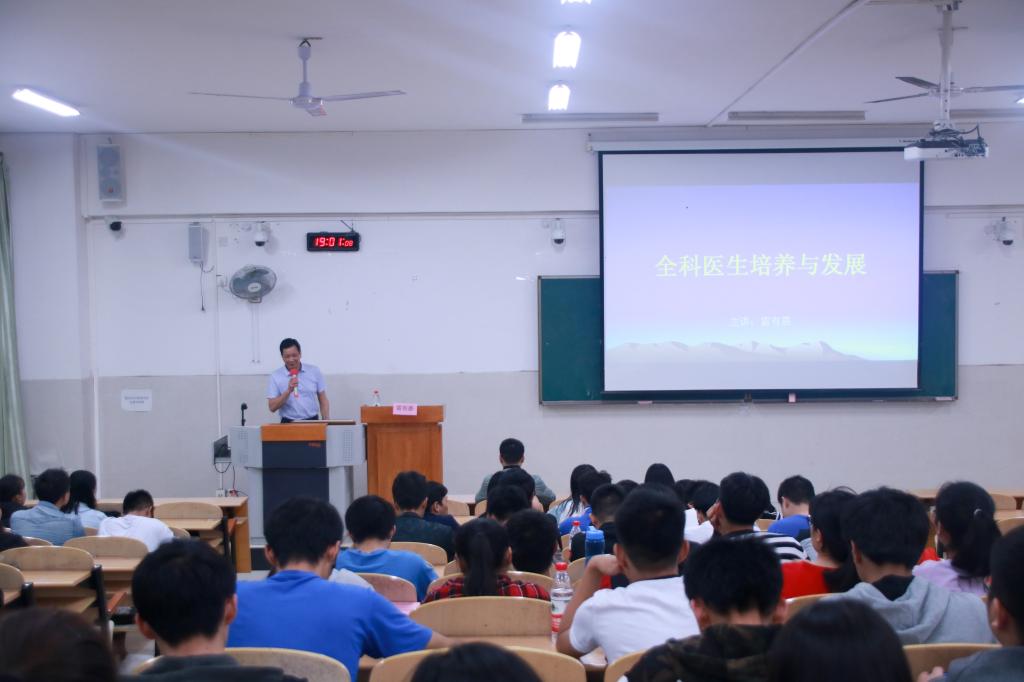 雷有恩主讲全科医生培养与发展,从全科医生培养模式与思考、全科医学发展历程与现状、解读关于改革完善全科医生培养与使用激励机制的意见,这几个方面向学生详细讲解全科医学的未来展望,告诉学生全科医生是全科医学的主要执行者,自新医改实施以来,大力培养全科医生是我国现有卫生服务体系的需要。同时,他提出现在我国对全科继续医学教育制度不断丰富,希望在校期间学生能够端正学习态度,树立专业信心,扎实专业技能,将来更好的满足我国全科医生队伍的建设需求。