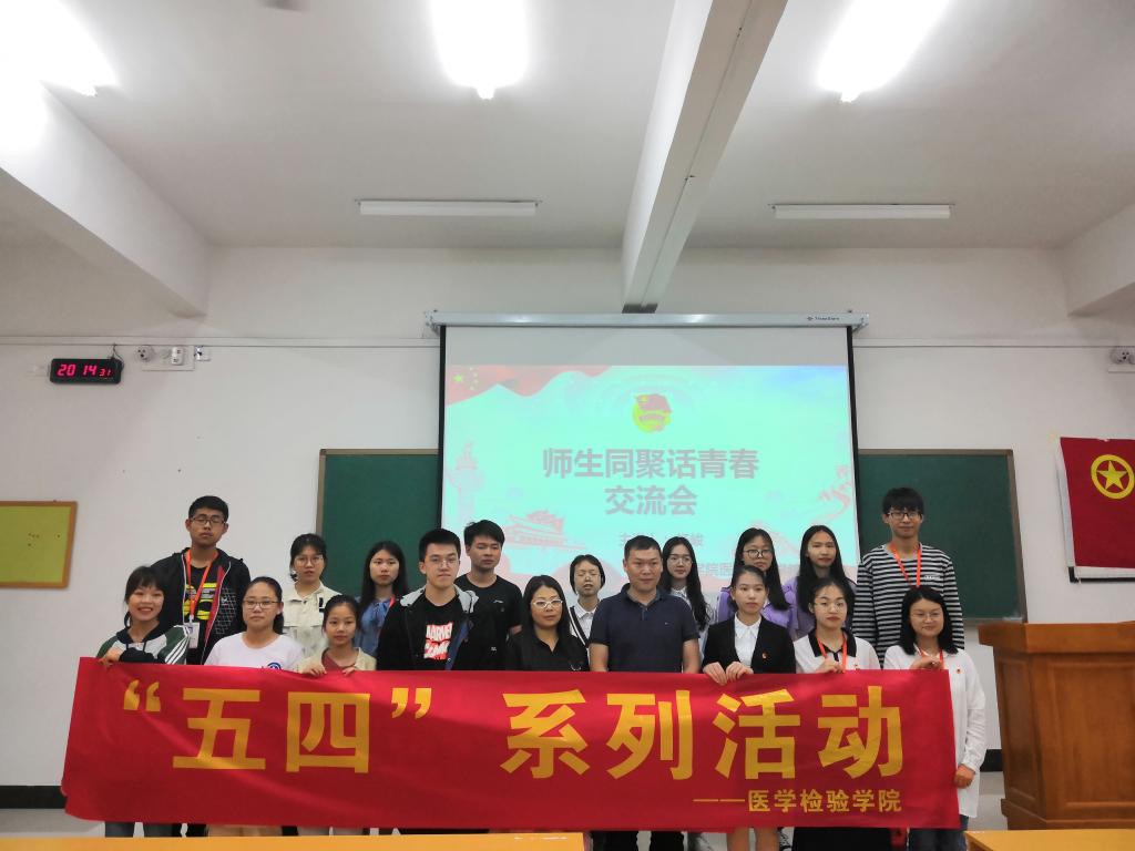 为纪念“五四”运动100周年,弘扬“五四”,营造良好的文化氛围。4月29日,医学检验学院在临桂校区教学北楼403召开"师生同聚话青春"交流会,附属医院检验科副主任、17、18检本班人生指导老师、班级导师杨峻博士、医学检验学院团委副书记王秀娟及17、18检本班全体学生参加此次交流会。