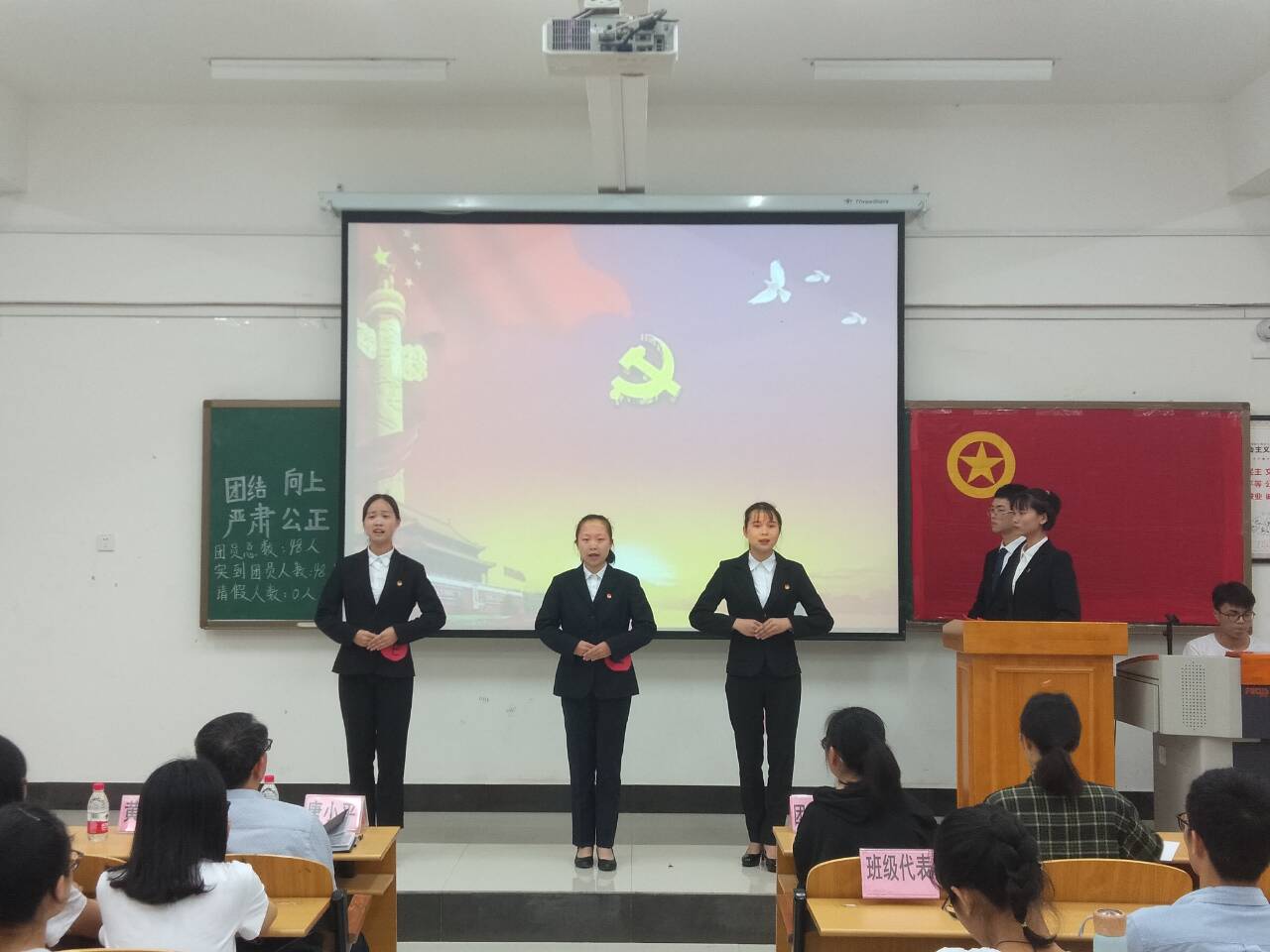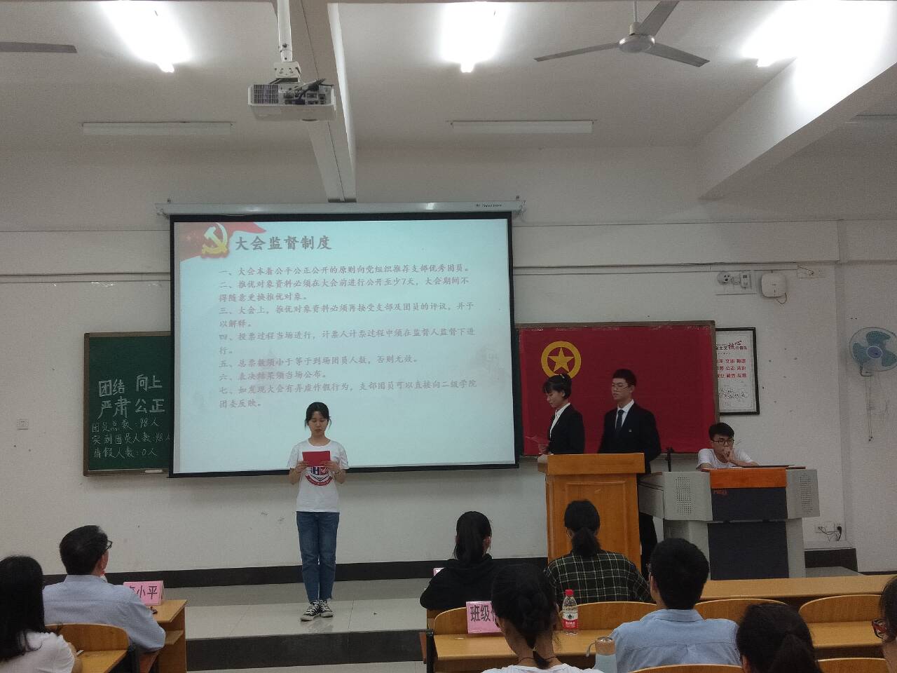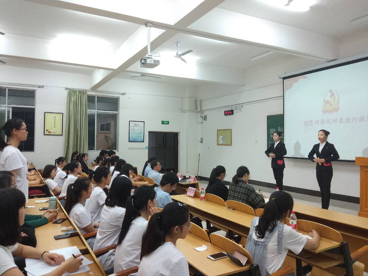 大会在团歌合唱声中拉开序幕。本着严肃,公平,公正的原则,团支书宣读了会议注意事项、大会监督制度及推优细则,同时介绍团支部概况及推优对象的基本情况和推优标准,整个流程规范有序。接着,五位推优对象莫秋红,杨雨珺,莫露婷,林晨露,梁文君通过诗歌朗诵和快板等形式表达了对党的认识和对党有着浓浓的向往与敬意,入党信仰坚定。评议、提问环节中,推优对象泰然处之,从容自如的阐述着自身的见解,坚定的答案,正诠释着新青年对党的热爱,表达了她们想要入党的决心。此外,通过提问,同学们对推优对象的思想、生活和工作情况有了进一步的了解。通过投票表决,这五名同学顺利通过了本次推优。随后,团委代表对本次推优大会进行简要点评,她希望推优对象能在未来的学习、生活和工作中,更加严格要求自己。最后,辅导员唐小平总结中指出,通过推优是入党过程中的重要一环,希望通过推优的同学更加系统地学习有关党的知识和专业理论知识,在学习、生活和工作中起到表率作用,为人民的健康作出贡献。