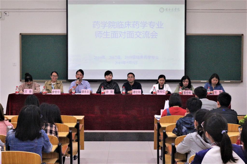 为服务学校“三全育人”工作,培养学生的临床药学专业能力,药学院于2019年5月5日晚在临桂校区N104开展了师生面对面交流会,参加活动的有药学院院长徐勤、党委副书记谭钦刚、副院长谭亲友,桂林医学院附属医院、桂林医学院第二附属医院临床药学专家黄桂红、廖曾珍、董晓敏、邓青等,以及各年级临床药学专业辅导员和全体学生。谭亲友副院长主持活动。