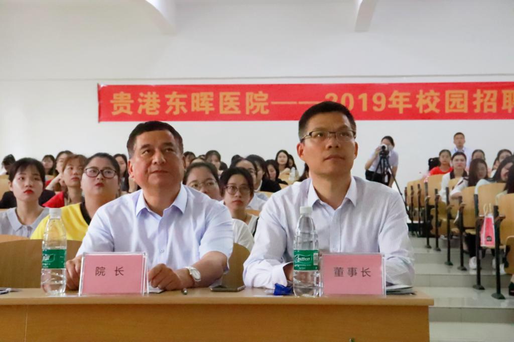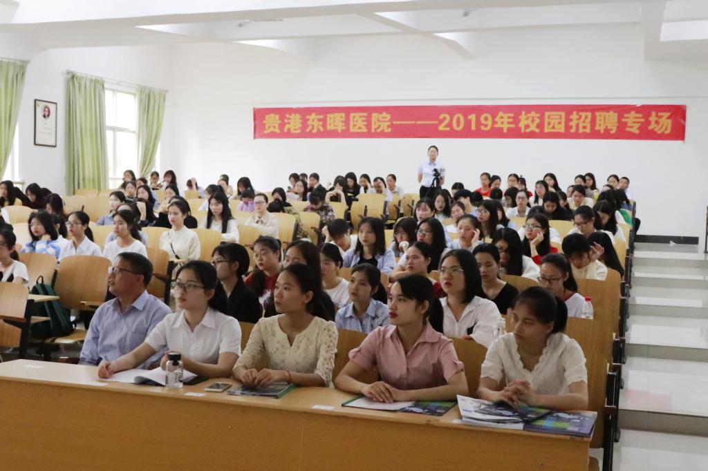 在招聘会上,各个医院负责人就医院概况、医院文化、医院目前的发展状况、今后的发展前景及对招聘入职的新职员的工资待遇等进行了宣讲。其中贵港市东晖医院宣讲会现场气氛最为热烈,医院董事长、院长亲临现场并对医院进行了详细介绍:贵港市东晖医院是由贵港市东晖公司投资建设,是一家以三级标准建设,集医疗、教学、科研、预防保健、康复疗养为一体的区域性、示范性、综合性医院,毕业生选择东晖医院将大有作为。经过考试和面试,东晖医院对我校毕业生的优秀表现表示了赞赏和肯定,将在20天内给出签约名单。招就处处长苏学勇、护理学院书记李寿芬、副书记唐小平及就业秘书阳萍亲临现场与用人单位领导见面交流,共同关心和推动护理学院2019届毕业生就业工作。