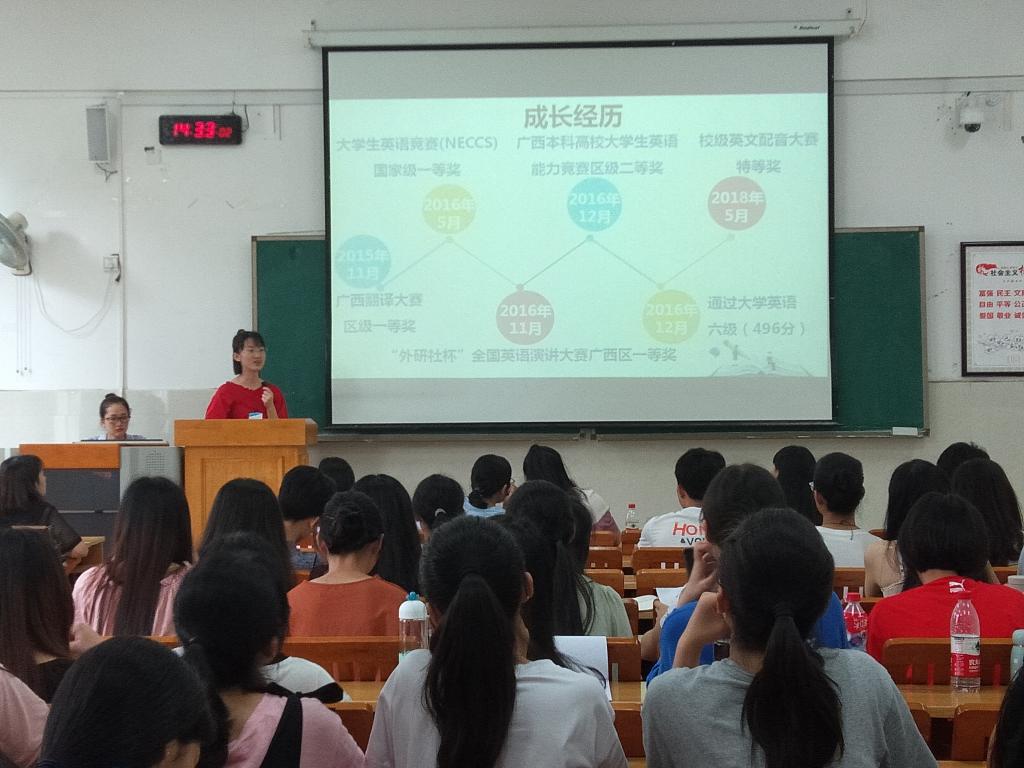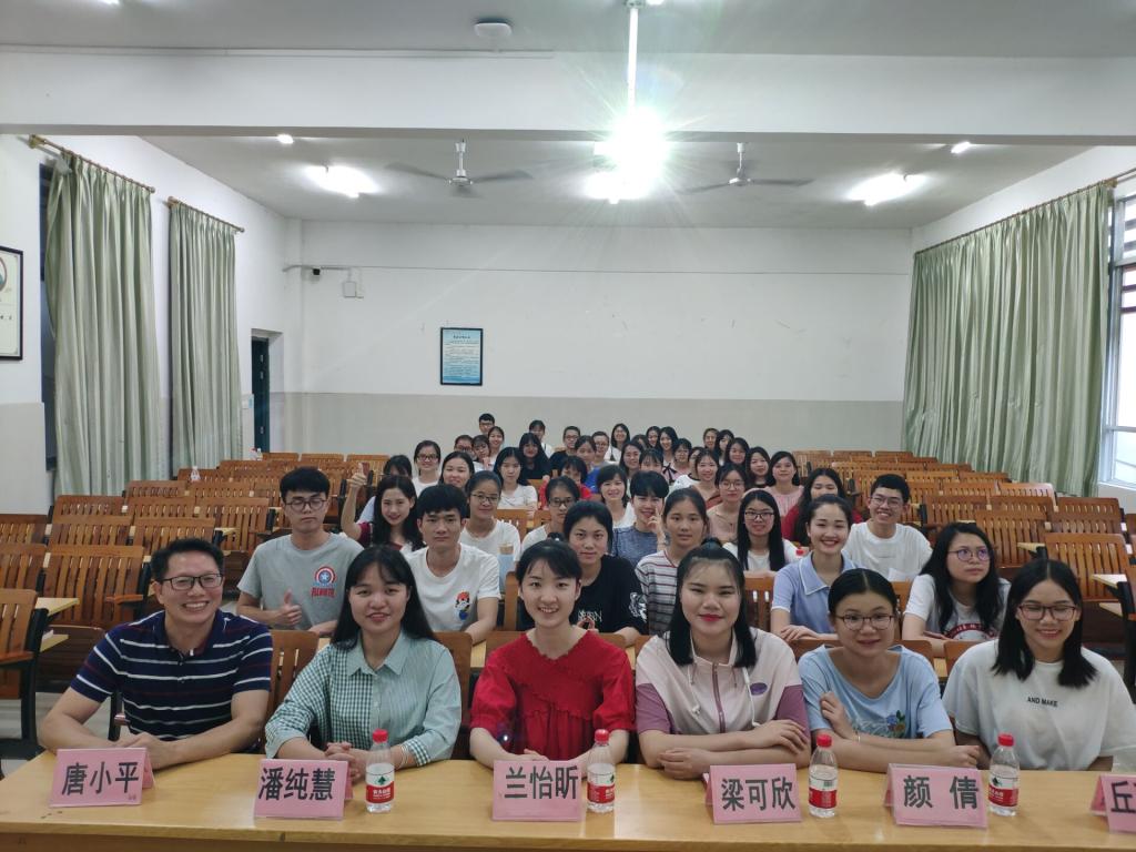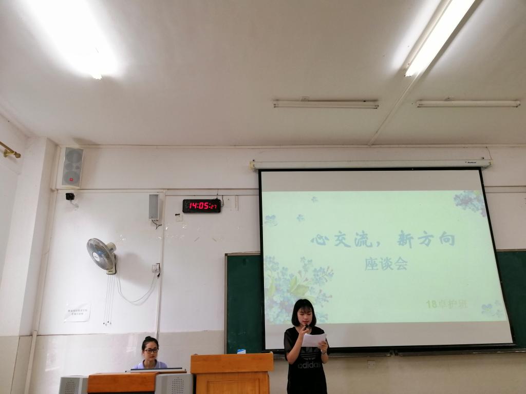 为了给同学们提供一个与毕业班优秀学生交流的平台,5月26日下午,在临桂校区教学楼S110教室,18卓越护师班开展了“心交流,新方向”座谈会,座谈会邀请到潘纯慧、兰怡昕、梁可欣、颜倩和丘丽君五位优秀学姐,辅导员唐小平、班主任黄姣娥及18卓越护师班全体同学参加会议。