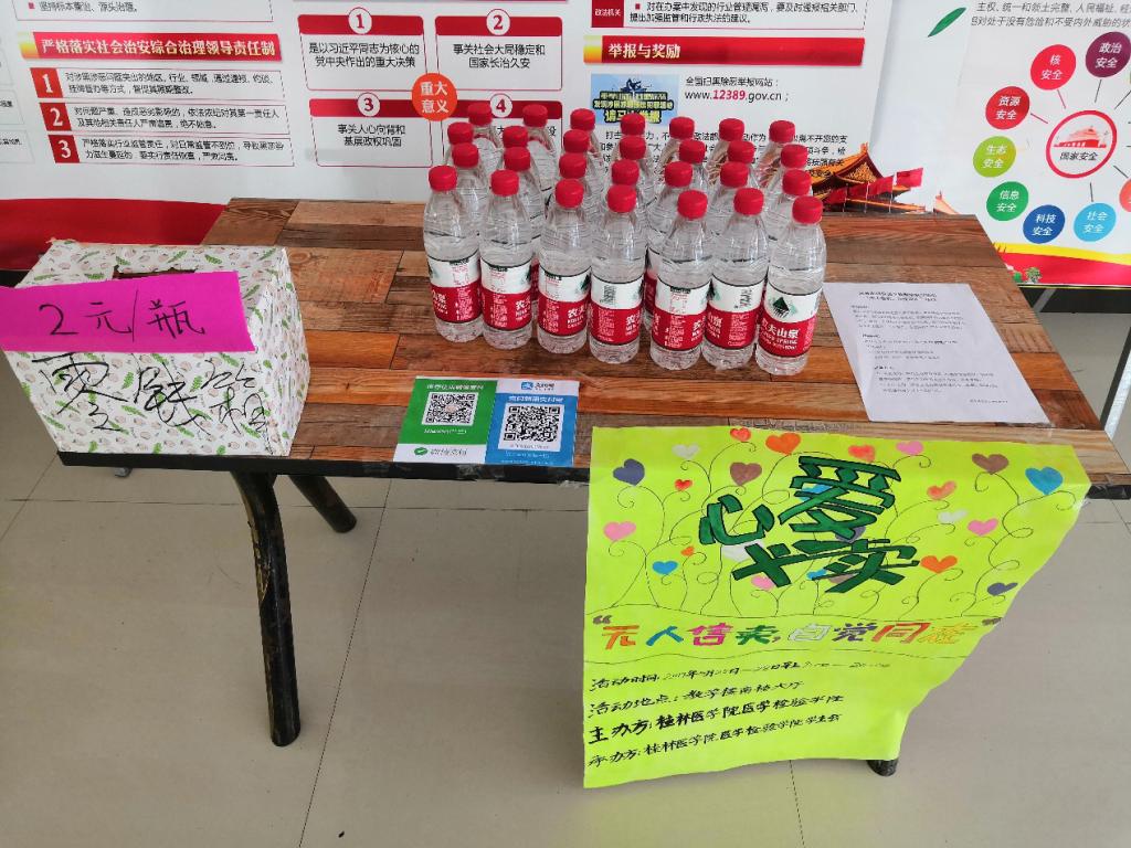 此次活动分别在大学生活动中心篮球场校道旁、南北楼、宿舍以及食堂开设售卖点,售卖物品主要有矿泉水,以及同学们捐出的一些义卖物品,包括各类书籍、运动器材等。活动前期主要通过线上QQ,微信宣传了此次活动。售卖期间,同学们自行挑选商品,并自觉付款、找零,体现出了同学们良好的自觉性与诚信意识。每天义卖结束后,学生会负责人都会对当天义卖所得钱款进行统计,并及时补充货源。