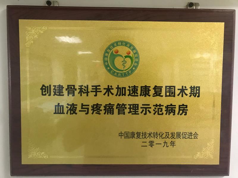 附属医院骨科科室于2019年荣获中国协和医科大学出版社、《中华骨与关节外科杂志》编辑部和白求恩公益基金会、中国研究型医院学会、中国康复技术转化及发展促进会联合颁发的“创建骨科手术加速康复围术期血液与疼痛管理示范病房”的授牌。