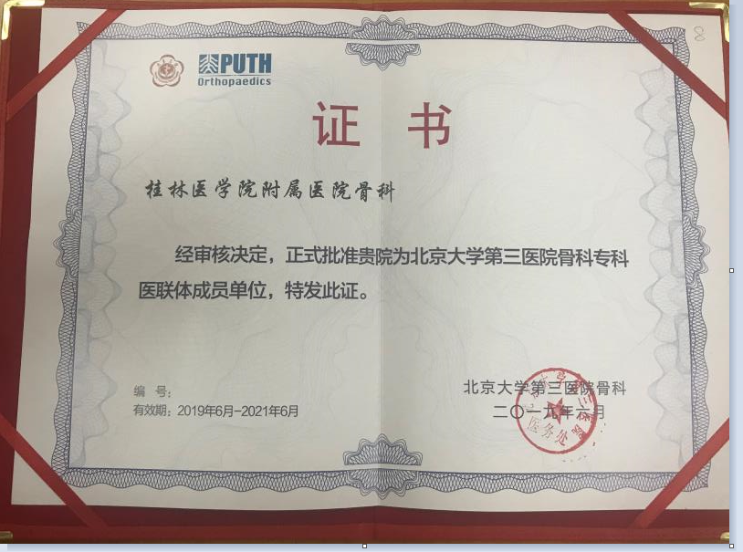 北医三院骨科是国内外具有较高影响力的学科并在骨科行业内处于领先地位,北医三院骨科专科医联体将以业务协作、培养人才、共享资源及共同发展为目标。附属医院此次获得了本次大会主办方的肯定并成为广西首家“北医三院骨科专科医联体”合作单位,这意味着,今后附属医院将与北医三院在骨科专科人才培养、骨科临床疾病研究、骨科疑难危重症远程会诊等方面展开深度合作,加快桂医附院骨科的发展,并更好地为桂北广大患者服务。