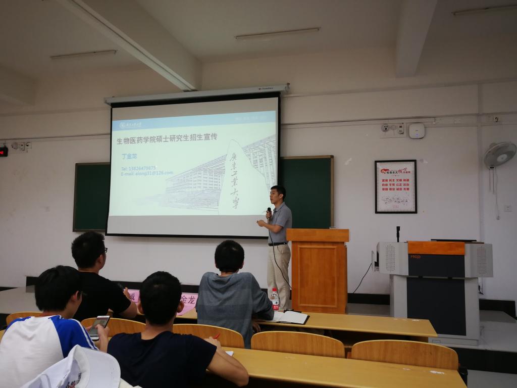 为鼓励更多优秀的同学考研深造,携手与区外兄弟院校开展学生交流活动,药学院于6月24日晚在临桂校区教室北楼开展了以“携手并肩,筑梦考研”为主题的考研宣讲交流会。广东工业大学生物医药学院副教授丁金龙、硕士研究生龙威、桂林医学院药学院学工办辅导员廖航和药学院有志于考研的同学参加了本次活动。