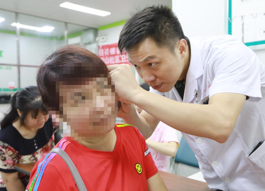 这是一个老年人群较多的社区,因而眼科副主任医师韦育江和中医科主任医师范剑薇显得特别受欢迎,前来就诊咨询的居民络绎不绝。韦医师给每个前来咨询的居民认真进行眼底检查,细心讲解和科普,忙得满头大汗,一直到看完所有居民,才顾得上喝水。范医师则忙着为居民们望闻问切,开中药处方或者给予养生调理建议。社区居民都露出满意的笑容,并纷纷点赞,感谢义诊专家。