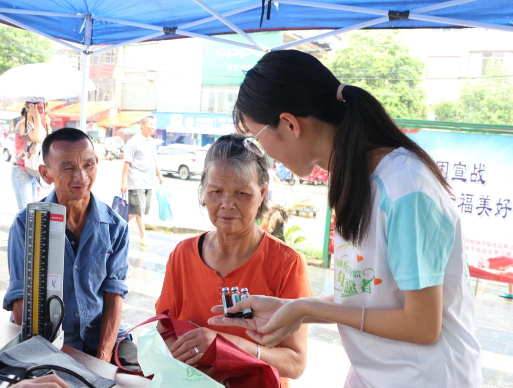 7月6日上午,在当地政府的大力支持下,志愿者们在两江镇人民政府门口开展了送医送药义诊活动,为当地居民测量血压、宣传药品知识、发放药品、指导填写儿童心理健康调查问卷等,志愿者们热心地解答村民们提出的疑问,耐心地向村民们讲解健康知识,给村民送去了温暖与健康。他们在基本医疗卫生知识普及工作上所作的努力受到了广大人民群众的支持与鼓励。
