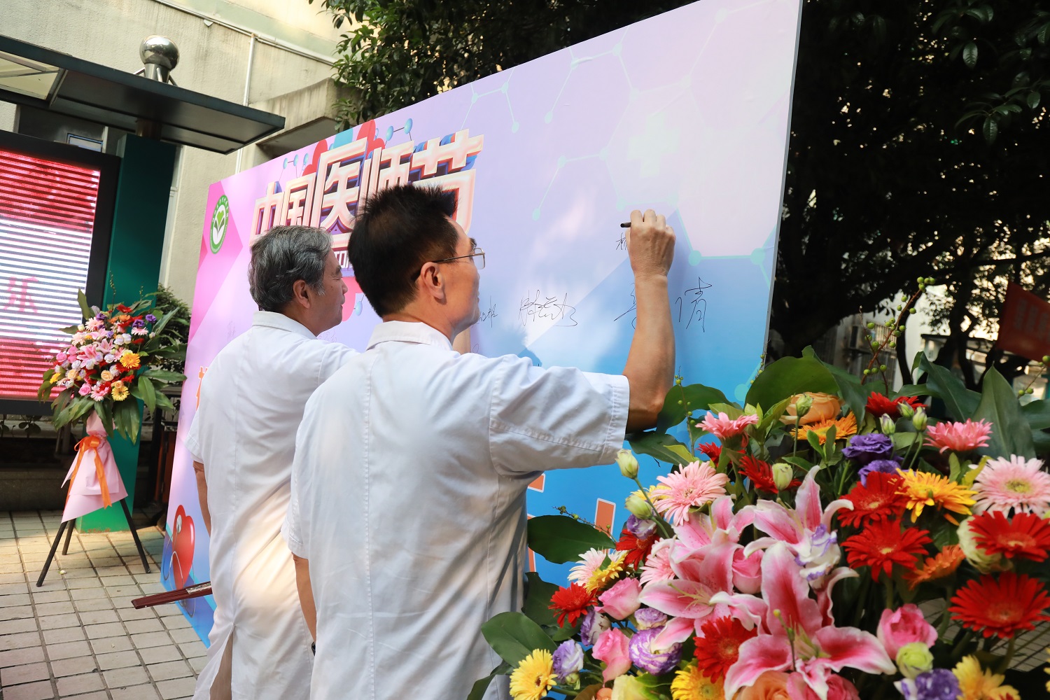 走到附属医院门诊小广场,一块立起来的大展板吸引了众多医护人员及群众的眼球。“中国医师节,祝全院医师节快乐”等几行大字渲染了浓浓的节日氛围。走近一看,上面签了不少医师的名字。