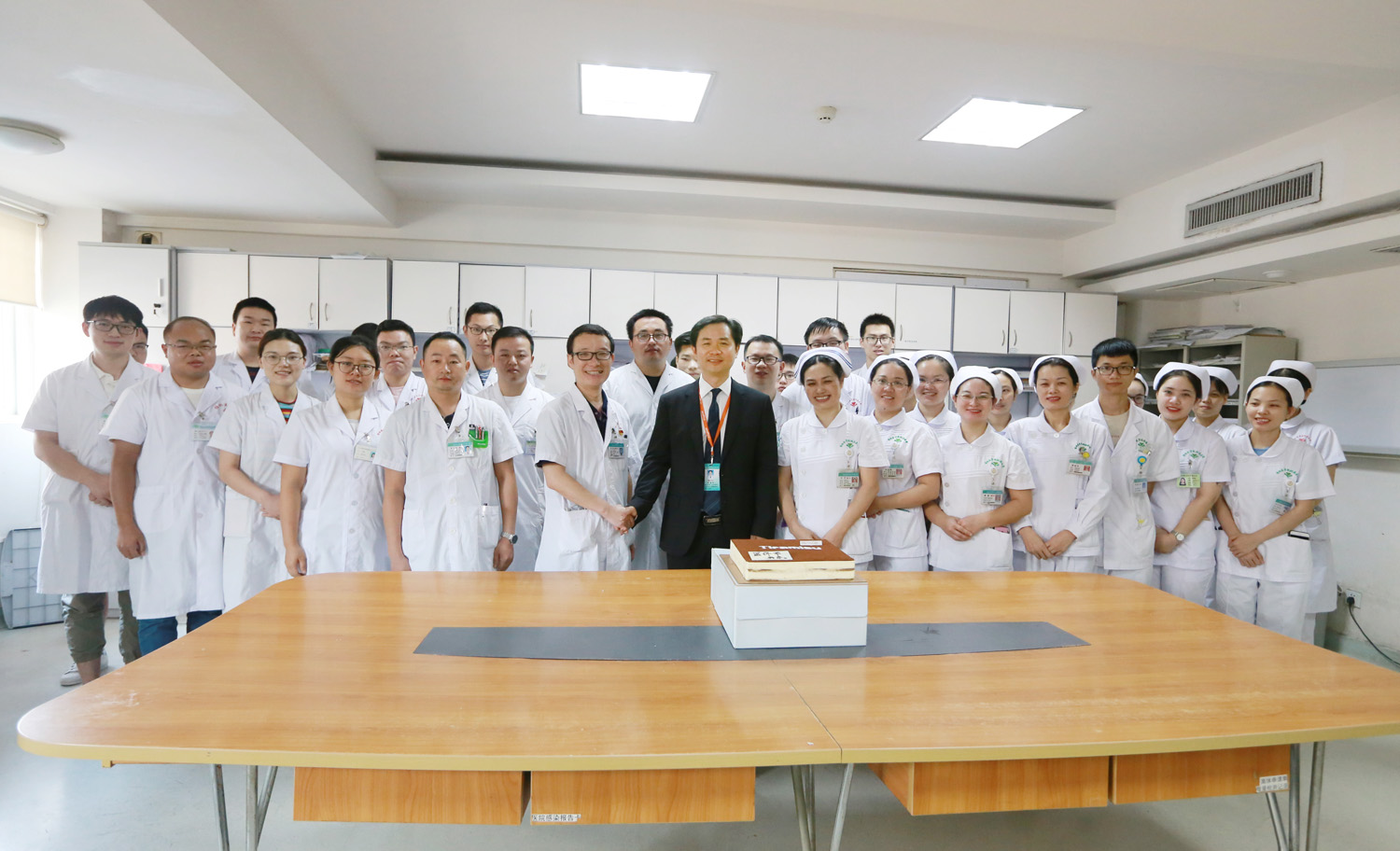 当天,文琼仙、李清华、蒋尧传、王海平、梁志清、庾俊雄 、金俊飞、滕若冰、蒋伟等院领导和相关职能科室负责人分成9个慰问小组,分别来到临床、医技科室,向奋战在一线的医师们致以节日的问候和祝福,并与大家共切蛋糕共庆医师节的到来。