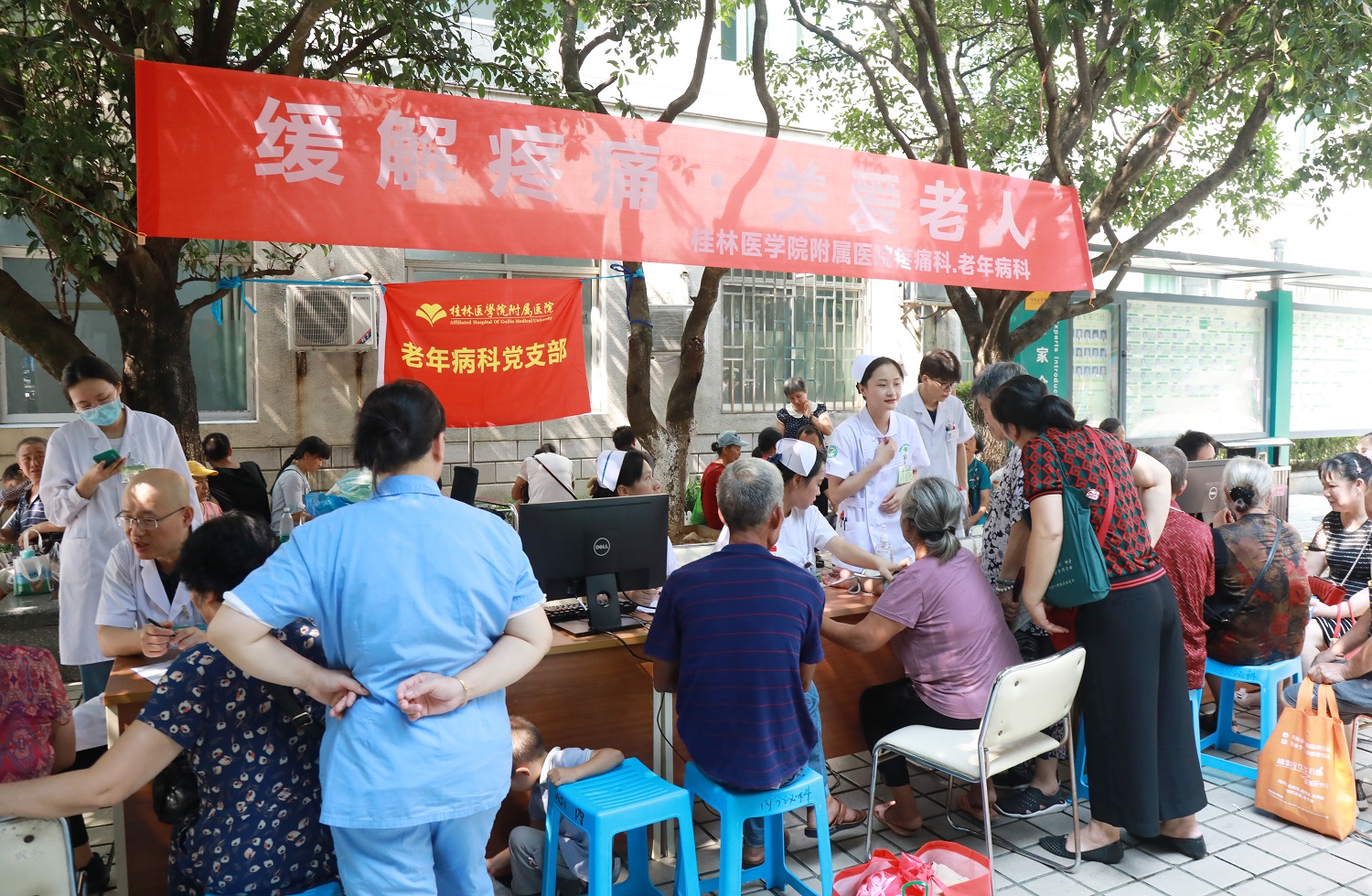 医师节当天上午,附属医院疼痛科、老年病科的医务人员选择为群众义诊的形式庆祝医师节。疼痛科主任公维义、老年病科副主任陈虹带领科室医生、护士、规培生、研究生、进修生等近20人在门诊楼前为群众答疑、诊查,发放健康科普资料,为患者提供治疗方案和预防保健康复指导等。