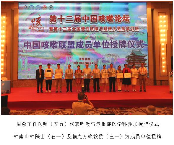 正因为呼吸与危重症医学科为区域内百姓健康保障做了大量行之有效的工作,得到了本次大会主席团的充分肯定。经讨论决定,授予首批中国咳嗽联盟成员资格并颁发首批中国咳嗽联盟成员单位牌匾,希望附属医院在咳嗽尤其是慢性咳嗽的诊疗水平更上一层楼,引领区域内业务发展,更好的为患者服务。