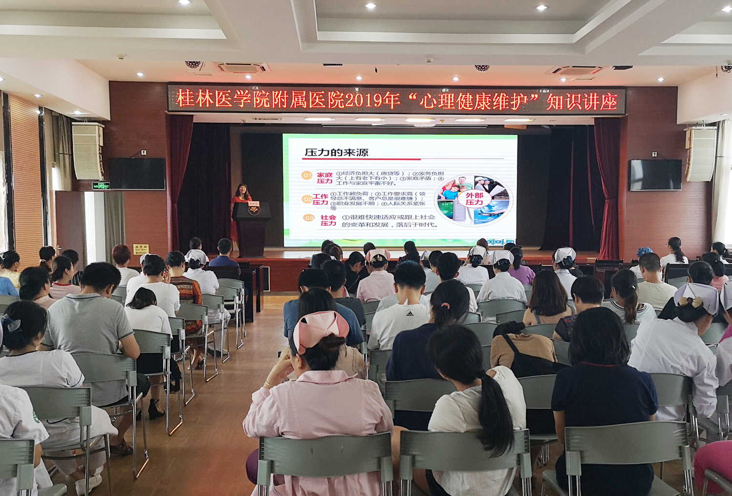 8月21日下午,附属医院在综合楼六楼多功能厅举办了职工心理健康维护知识讲座。广西师范大学教育科学学院心理系教授、桂林市总工会职工心理咨询顾问余欣欣应邀为医院职工讲解“心理健康与压力管理”。活动由附属医院工会组织,工会女工委主任莫国华主持,200多名医务人员聆听了讲座。