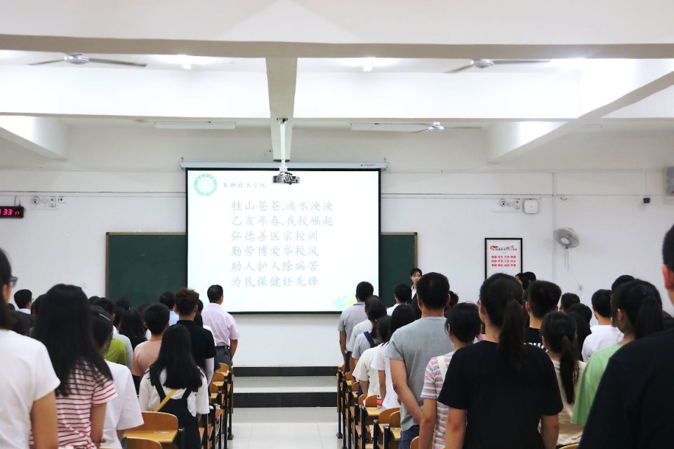 伴随着嘹亮的桂林医学院校歌,见面会拉开序幕。孙立元院长为欢迎见面会致辞,代表学院党政对新同学、家长的到来表示热烈欢迎。他首先介绍了桂林医学院、生物技术学院的基本情况、发展历史和办学优势,希望新生们珍惜大学时光,勤于学业,刻苦钻研,夯实基础,努力提高自己的专业技能。