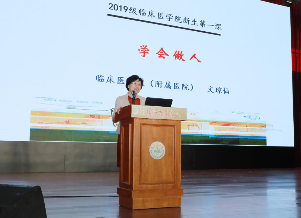 最后,文琼仙为同学们上大学第一课。学会做人是立足社会的根基,文琼仙从“要有自觉心、要对自己所扮演的角色有一个明确的定位、要有自信心、要有责任心、要善于与人交往、要有同理心、同情心以及要有良好的心态”八个要点,教育同学们如何学会做人。她希望同学们能做一个有文化有修养的人,做一个善良、有品位的医生,以自谦的精神、自信的状态、自律的意识来面对人生中的每一天。