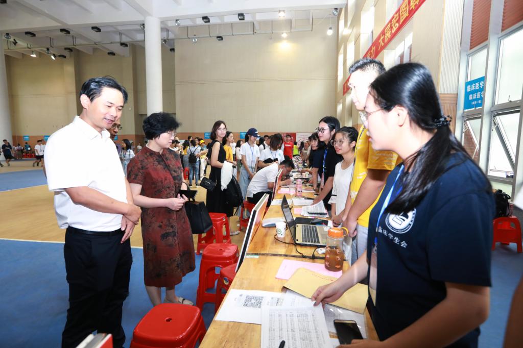临床医学院党委书记文琼仙、院长李清华、副书记王海平来到报到现场指导工作,看望问候新生及家长,并帮助大家排忧解难。同时,院领导还看望并慰问参与迎新工作的师生员工,与新生及辅导员、班主任等亲切交流。