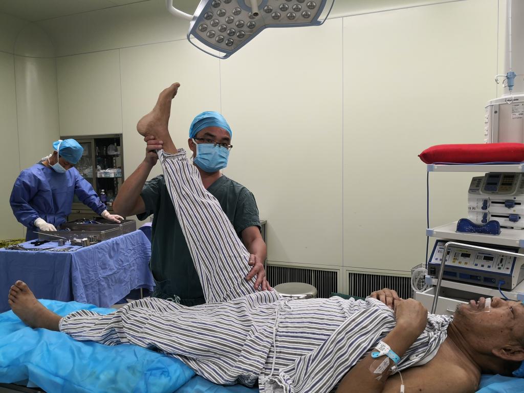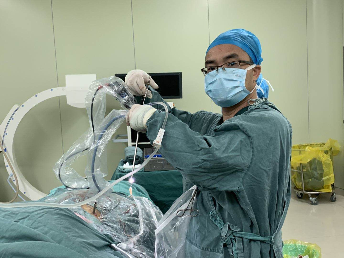 “患者合并症多,手术存在一定的难度,为此我们组织全科的医生进行了讨论。”骨科梁立升副教授表示,经科室医生讨论后,认为患者的症状是由于4/5腰椎间盘突出的髓核压迫相应的神经根所致,但患者病情复杂,开放手术易引起大出血、术后感染,因此决定采用微创手术进行治疗。“我院开展椎间孔镜技术已有近5年的时间,技术成熟,手术时间短,可最大限度的避免并发症的出现。”梁立升介绍说,为确保手术的顺利进行,科室主任胡军祖教授还特意为病人制定了详细的手术方案。