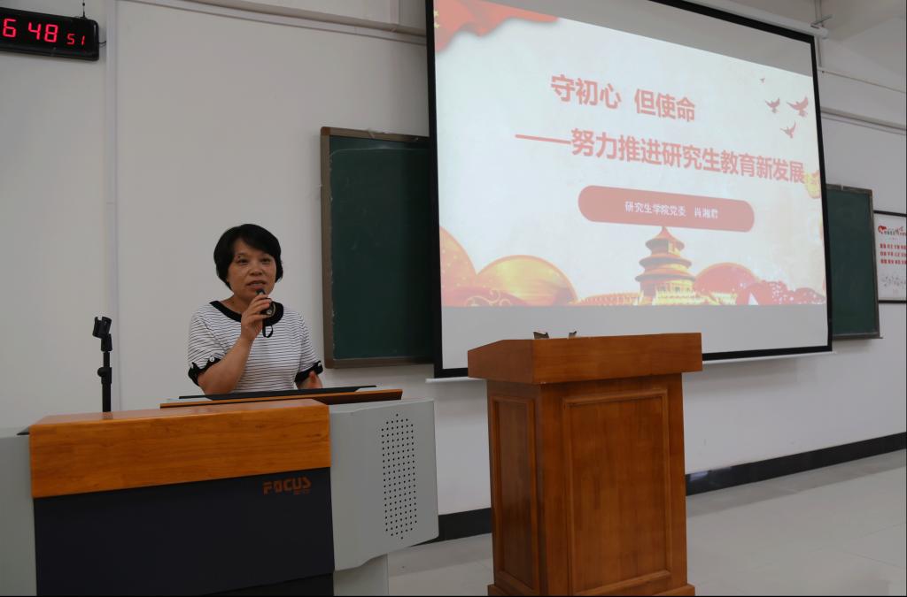 会上,研究生学院党委书记、研究生工作部部长肖湘君结合研究生学院实际,从主题教育活动的“为什么?学什么?怎样学?”三方面阐述了如何将“不忘初心,牢记使命”主题教育深入开展,她希望研究生学院师生党员,要深入学习贯彻新时代中国特色社会主义思想,落实好学校党委的各项部署,把主题教育作为当前和今后一个时期最重要的政治任务。要以学院领导班子为重点、研究生各党支部为核心,将总要求、根本任务、具体目标、四个措施贯穿始终,开展好研究生学院“十个一”主题教育活动。同时结合“守初心、担使命,努力推进研究生教育新发展”专题进行研讨发言,她从“坚守立德树人理念、加强研究生主流思想引领、深化研究生培养改革、构建协同育人新体系”等方面谈了自己的学习体会,希望大家边学边研边改,将主题教育和中心工作紧密结合,为学校“更大建博”工作做出积极努力。