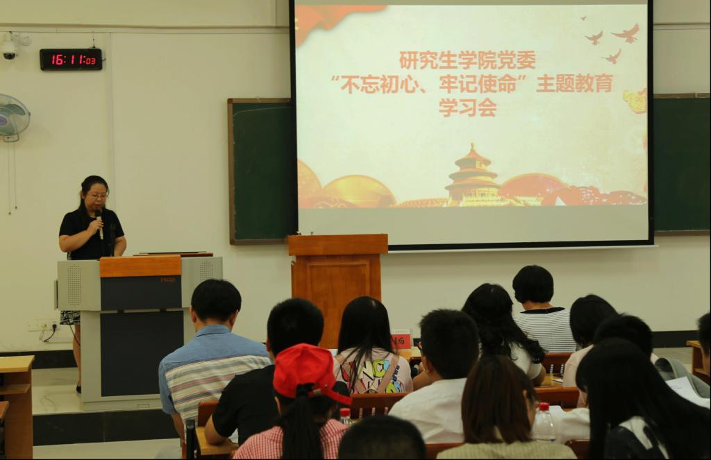 为贯彻落实校党委《关于开展“不忘初心、牢记使命”主题教育实施方案》的具体要求,扎实开展研究生学院“不忘初心、牢记使命”主题教育,9月22日下午,研究生学院党委在临桂校区教学北楼407室组织召开“不忘初心、牢记使命”主题教育学习会。研究生学院、研究生工作部全体教师及各研究生党支部委员、党员代表、学生干部代表参加大会。