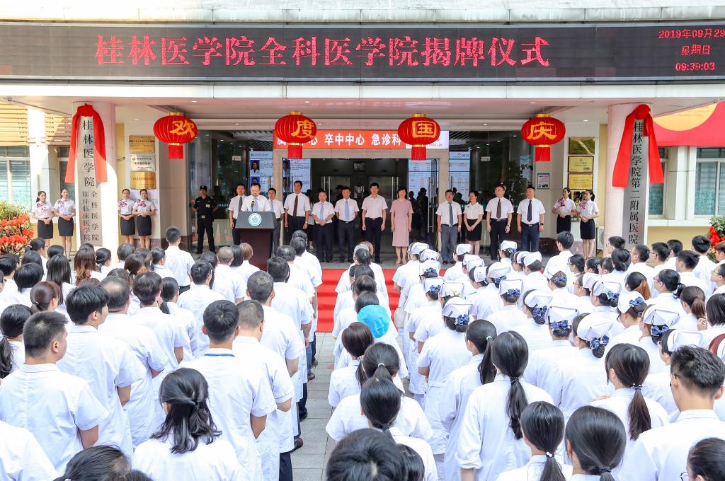 近年来,桂林医学院第二附属医院一直致力于做好医疗质量、安全的提升和学科建设,积极开展全科医学教学工作。当前,“健康中国”上升为国家战略,桂林国际旅游示范基地的建设为医学教育和医疗卫生领域的发展带来了新机遇,学校实现更名大学的目标提出了新要求。凭借此次揭牌仪式的东风,医院将以“院强校兴”为重点,深化医疗改革、提升服务水平、强化学科建设、创新人才培养,不断提升教学科研的层次与实力,真正做到医、教、研齐头并进,用更积极、主动的发展态势促进区域医药卫生、教育事业和经济社会的提升,以更优异的成绩为学校实现更名大学增彩,为中华人民共和国成立70周年献礼。