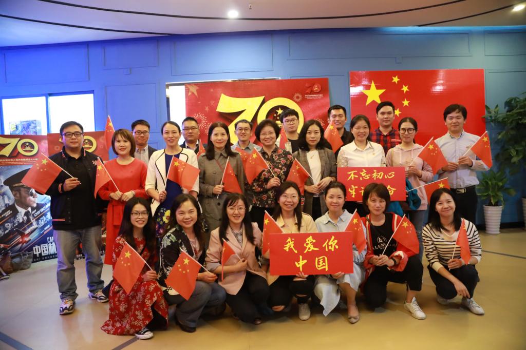 影片放映前,大家情绪高涨,挥动手中国旗,高声唱起《我和我的祖国》为影片热场。